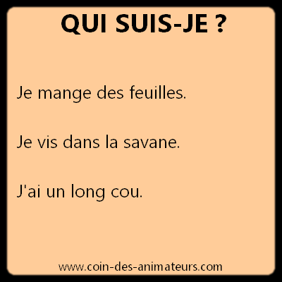 Je mange des feuilles. Je vis dans la savane. J’ai un long cou.