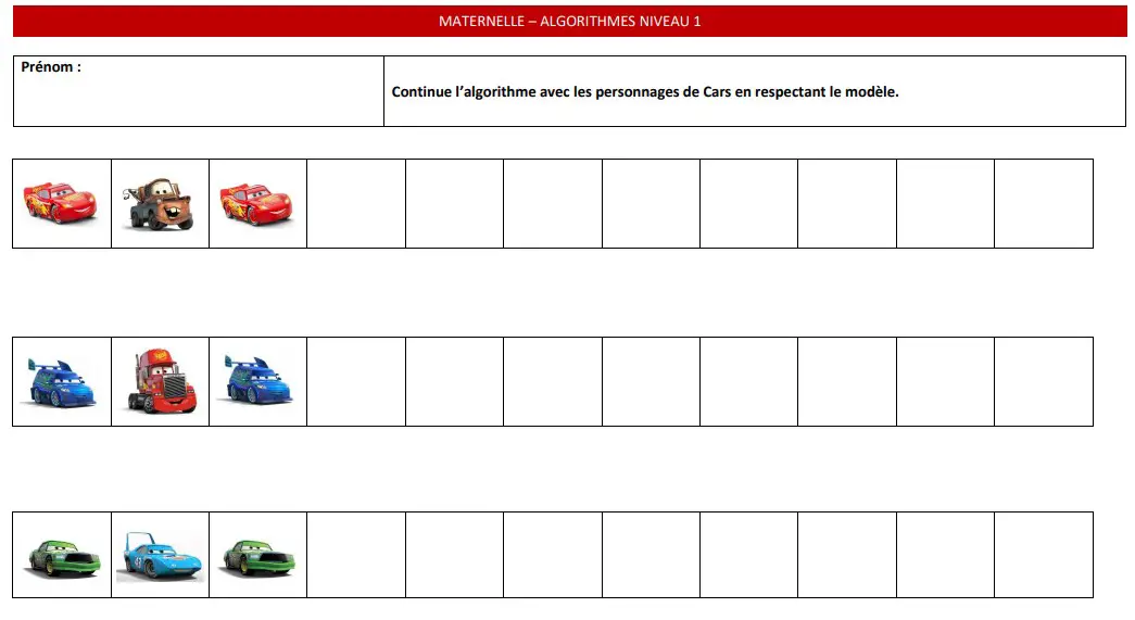 - Algorithmes Cars (3 niveaux) : Initiez-les à la logique en complétant des suites simples à complexes.