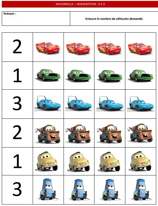 - Numération Cars : Apprenez à compter avec des exercices progressifs de 0 à 10.