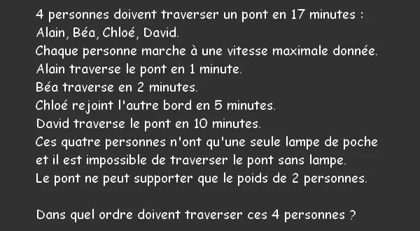 4 personnes doivent traverser un pont en 17 minutes: Alain, Béa, Chloé, David. Chaque personne marche à une vitesse maximale donnée.