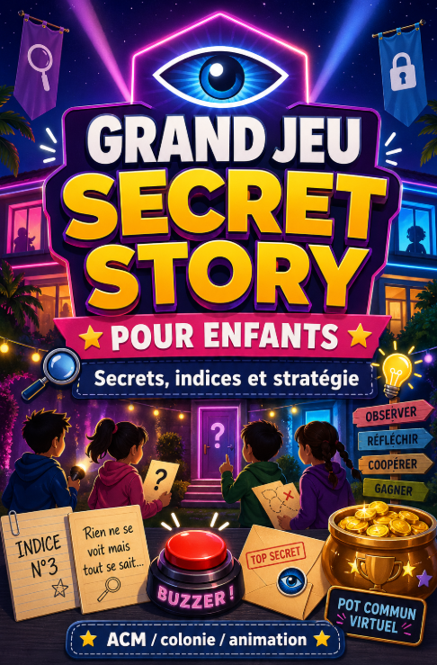 Inspiré de l’émission télévisée Secret Story , ce grand jeu pour enfants (ou même pour animateurs) plonge les participants dans une enquête mystérieuse où ils découvriront les secrets de leurs camarades tout en gardant le leur caché. Ce jeu peut durer tout au long de la période du centre de loisirs, permettant aux enfants de vivre une aventure palpitante.